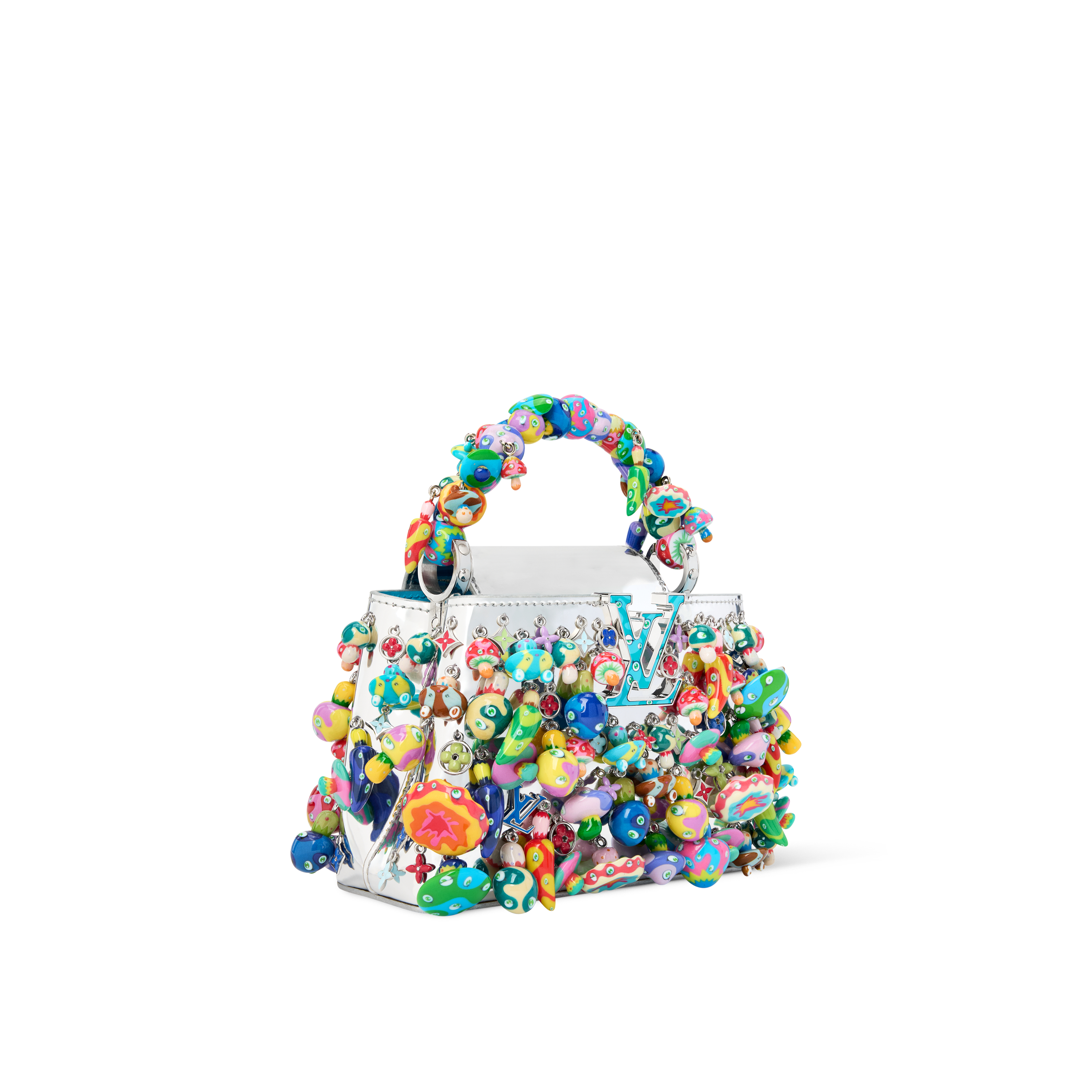 注目すべきアイテムのひとつがカプシーヌ EW レインボー。クラシックな構造を再構築し、村上の代表作である「レインボー・フラワー」のフォルムを模したバッグは、万華鏡のようなカラフルさで視線を集める。また、カプシーヌ ミニ マッシュルームでは、幻想的なキノコキャラクター約100体を一体ずつ手作業で磨き上げ、シルバーミラーキャンバスに刺繍で取り付けるという緻密な工程で、サイケデリックな世界が表現された。カプシーヌ ミニ テンタクルは、村上の分身として知られるキャラクター「DOB君」をタコに変身させた彫刻作品に着想を得ており、驚きとユーモアを兼ね備えてたデザインに仕上がった。
