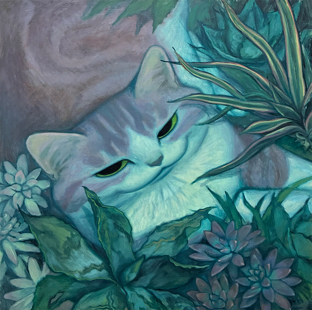 Karin Hosonoは2002年、神奈川県生まれ。多摩美術大学油画専攻卒業。10歳の頃から一貫して「猫」をモチーフに制作を続け、長年の探究を通して独自のフォルムと表現へと辿り着く。また、近年はこれまで培ってきた観察眼や猫と触れ合うなかで得た感覚を生かし、立体作品の制作にも取り組んでいる。